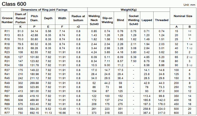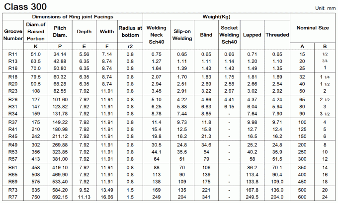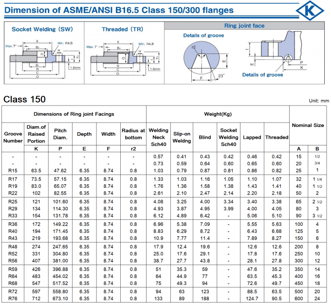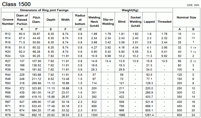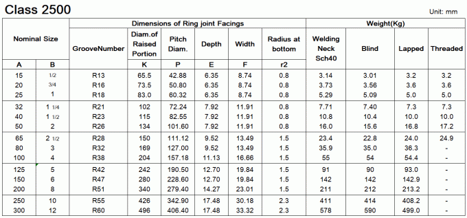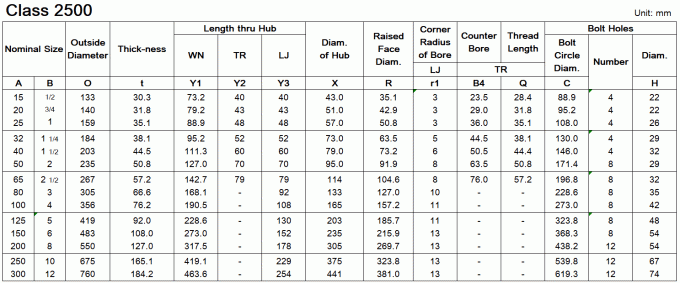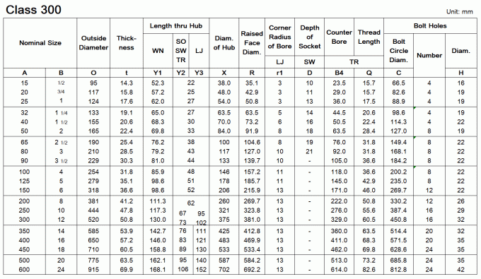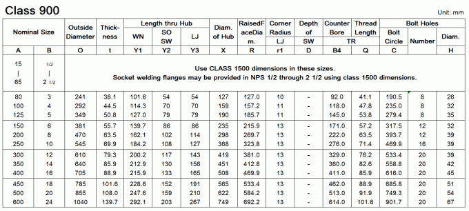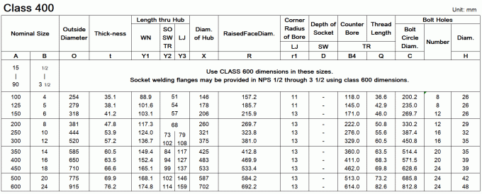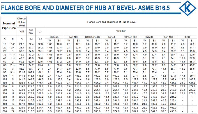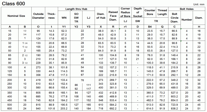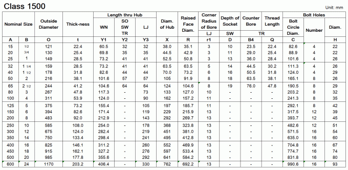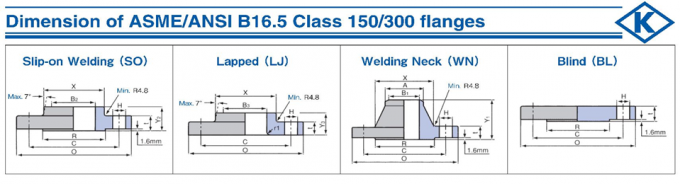 Dimensions of ASME/ANSI B16.5