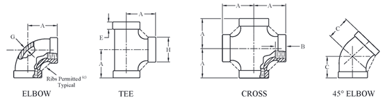 SP-114 Dimensions of Class 150 Cast Threaded 45/90 Degree Elbows, Tees and Crosses. (in inches)