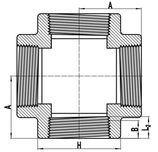 The drawing of ASME B16.11 forged tee with threaded (THD) ends. A: center-to-end of cross; H: outside diameter of band; G: minimum wall thickness; B: minimum length of perfect thread; L2: effective length of external thread.