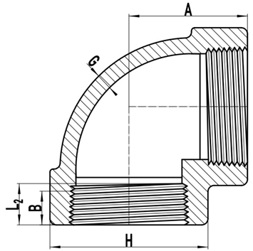 Note: A: center-to-end of threaded elbow; H: outside diameter of band; G: minimum wall thickness; B: minimum length of perfect length; L2: length of useful thread.
